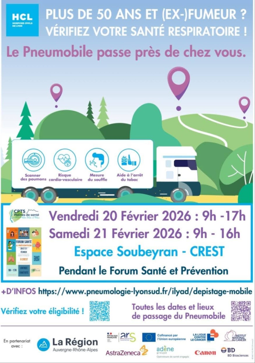 Le pneumobile passe près de chez vous lors du forum de Santé et Prévention, rendez-vous les vendredi 20 février de 9h à 17h et samedi 21 février de 9h à 16h à l'espace soubeyran à CREST.