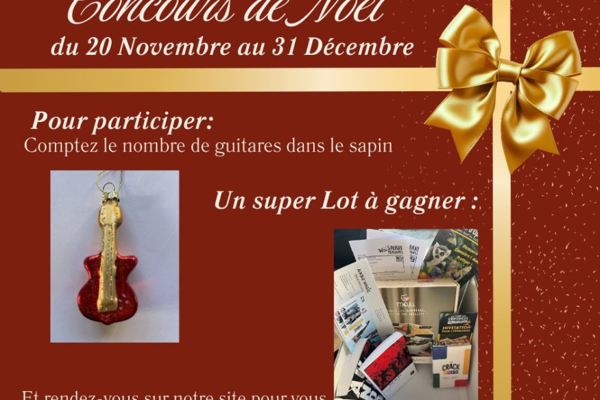 Jusqu'au 31 décembre, partez à la découverte de notre vitrine situé au 23 rue de l'armillerie à Romans et comptez le nombre de guitares présentent dans notre sapin pour remporter un super lot composé de :