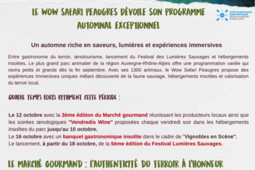 Le 12 octobre avec la 3ème édition du Marché gourmand réunissant les producteurs locaux ainsi que les soirées œnologiques "Vendredis Wine" proposées chaque vendredi soir dans les hébergements insolites du parc jusqu'au 10 octobre.