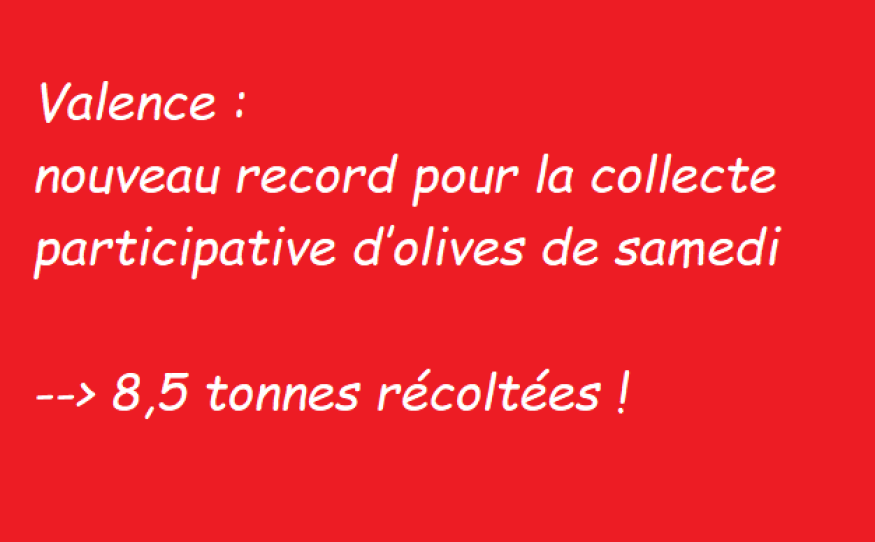 Cette année, la collecte bat tous les records avec 8,5 tonnes d’olives récoltées par les Valentinois, au lieu de 3,3 tonnes l’an passé et d’1,82 tonnes pour la première édition en 2021.