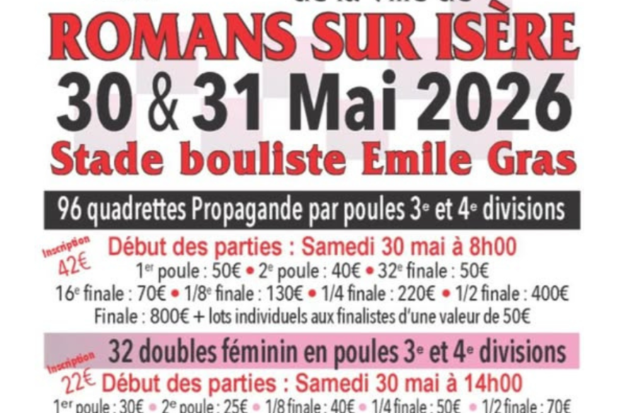 Le sport boules est à l’honneur à Romans-sur-Isère ! Les 30 et 31 mai 2026, notre ville vibrera au rythme de la 71ème édition du Grand Prix de la Ville, un rendez-vous historique et incontourna...