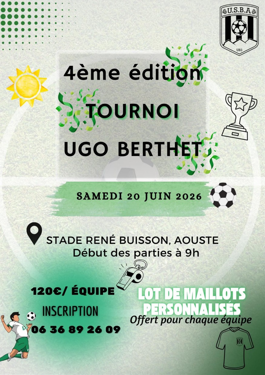 L’USBA organise son traditionnel Tournoi Ugo Berthet le Samedi 20 juin 2026 au Stade René Buisson – Aouste-sur-Sye et vous attend nombreux pour une journée de football, de compétition et de convivialité ????