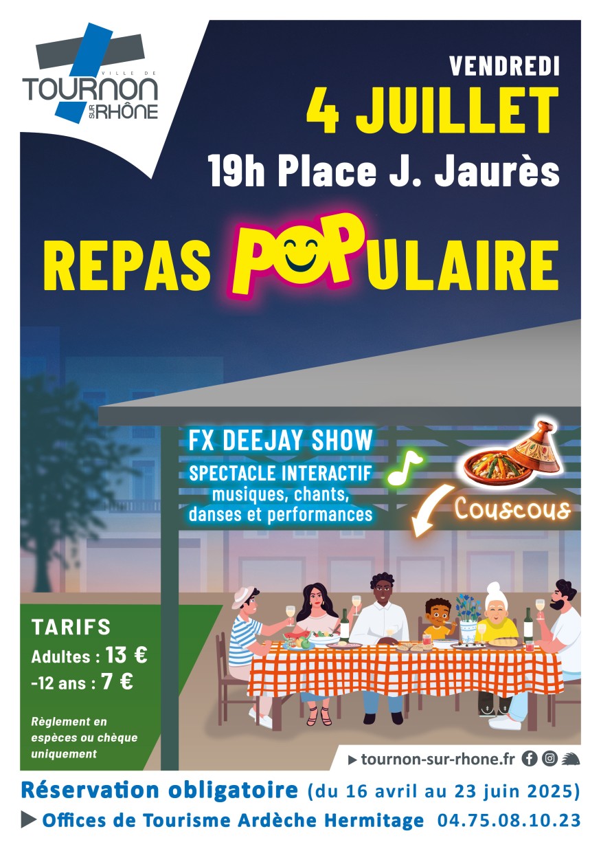 Le repas est à réserver obligatoirement auprès des Offices de Tourisme Ardèche en Hermitage (04 75 08 10 23) jusqu’au 23 juin. Le tarif du repas est de 13 € (et 7€ pour les enfants de moins de 12 ans) à régler uniquement par chèque ou espèces.