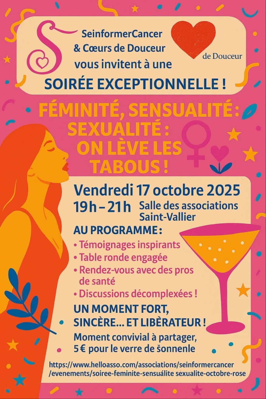 Dans le cadre d'octobre rose, retrouvez Valérie Fournier pour la soiré exceptionnel du 17 octobre : Féminité, sensualité, sexualité : on lève les tabous.